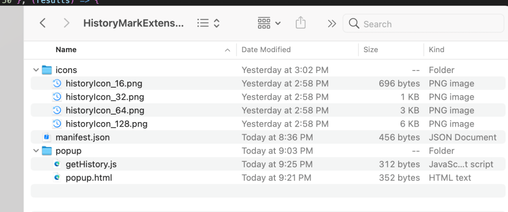 To get the history with chrome.history, I created a new JavaScript file called “getHistory.js”.